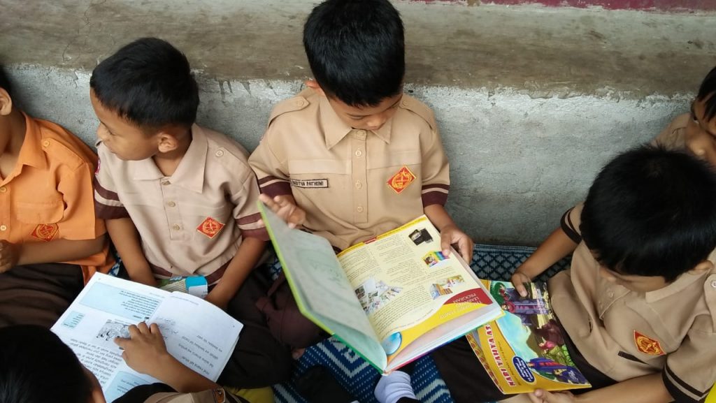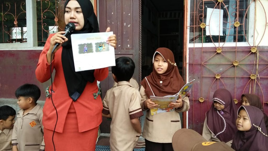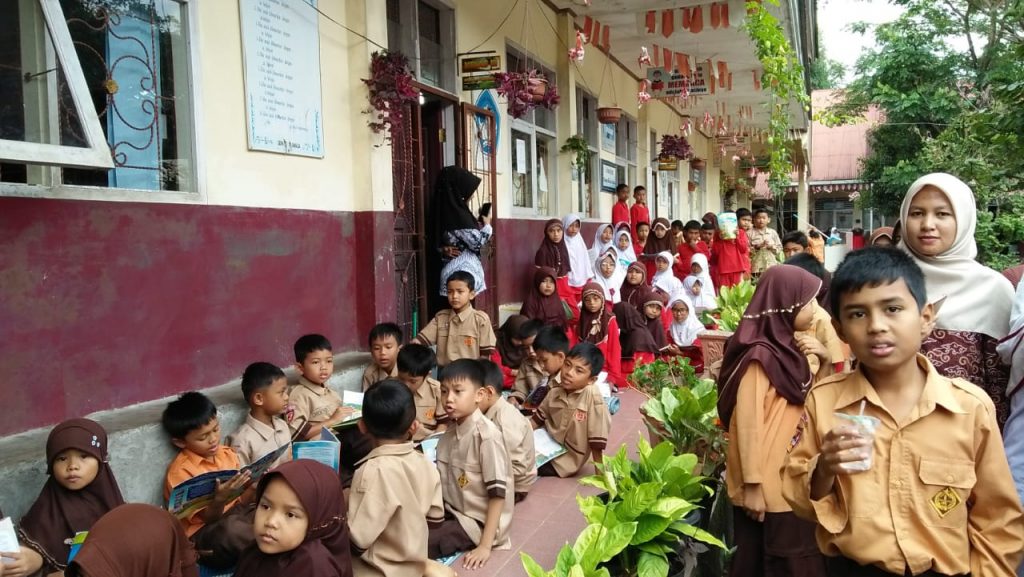 Dalam kunjungan ke perpustakaan siswa/i nonton bareng film edukasi anak-anak.
